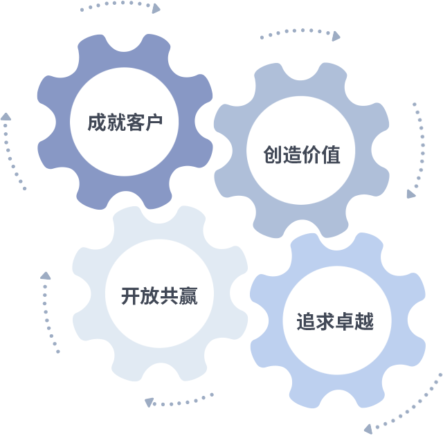成就客户是一切决策的出发点,创造价值是衡量所有工作的标准,追求卓越是MG不朽情缘做事做人的态度,开放共赢是MG不朽情缘的格局也是最终的结果。价值观的齿轮环环相扣,推动着组织里的每个人不断向前。